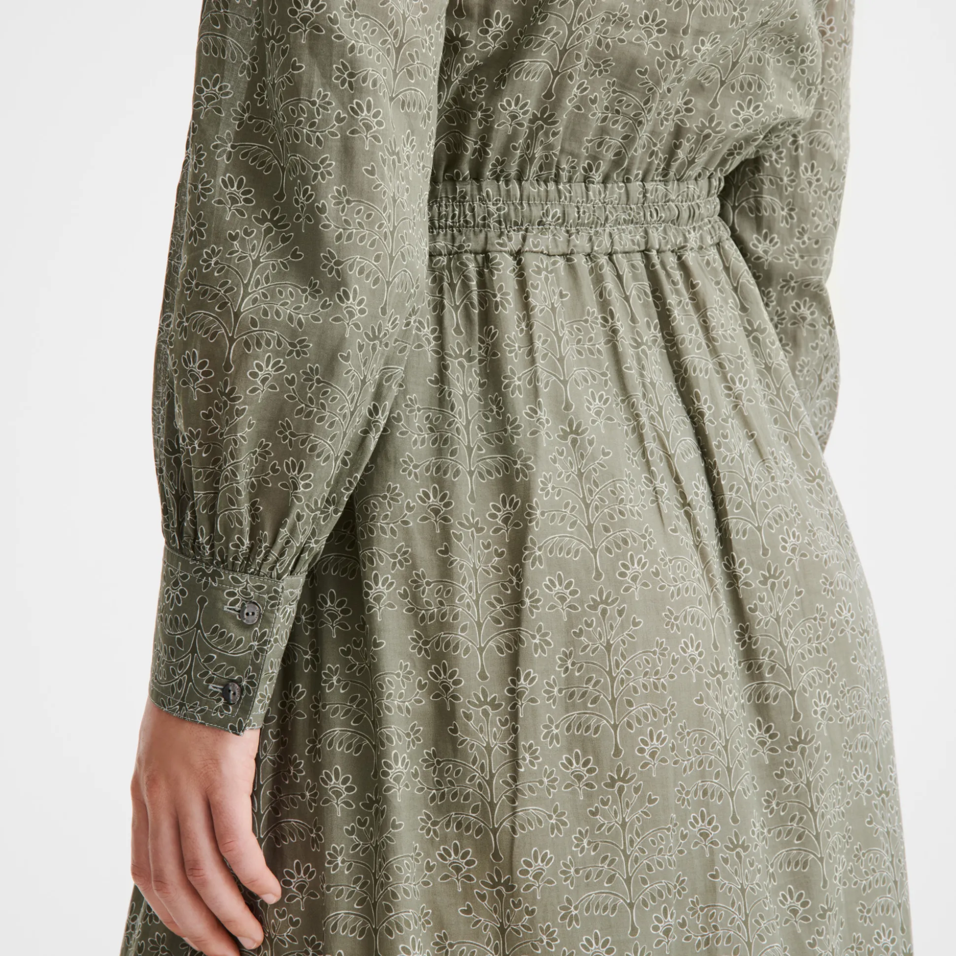 Dieses Maxikleid aus bedrucktem Baumwollvoile fängt den rustikalen und authentischen Charme des Landlebens ein. Mit Hemdkragen, langen Ärmeln und einem elastischen Bund, der die Silhouette betont, entsteht ein femininer Look mit einer lässigen, selbstbewussten Ausstrahlung. In dieser Saison strahlt die Konfektionskollektion der Maison eine anregende, optimistische Energie aus – voller Lebendigkeit, Freude, Zeitlosigkeit und mit einem Hauch rustikalem Charme, perfekt für selbstbewusste Freigeister. Die Pariserin navigiert mühelos durch den Kontrast zwischen städtischem Trubel und ländlicher Ruhe. Sie geht nahtlos über von einem Look mit kräftigen pinken Akzenten zu einem Ensemble mit Farben und Mustern, die von einem Gemüsegarten mit natürlichen, fruchtigen Grüntönen inspiriert sind. Sie enthüllt anmutig jede Facette ihrer selbst und bleibt dabei immer elegant.