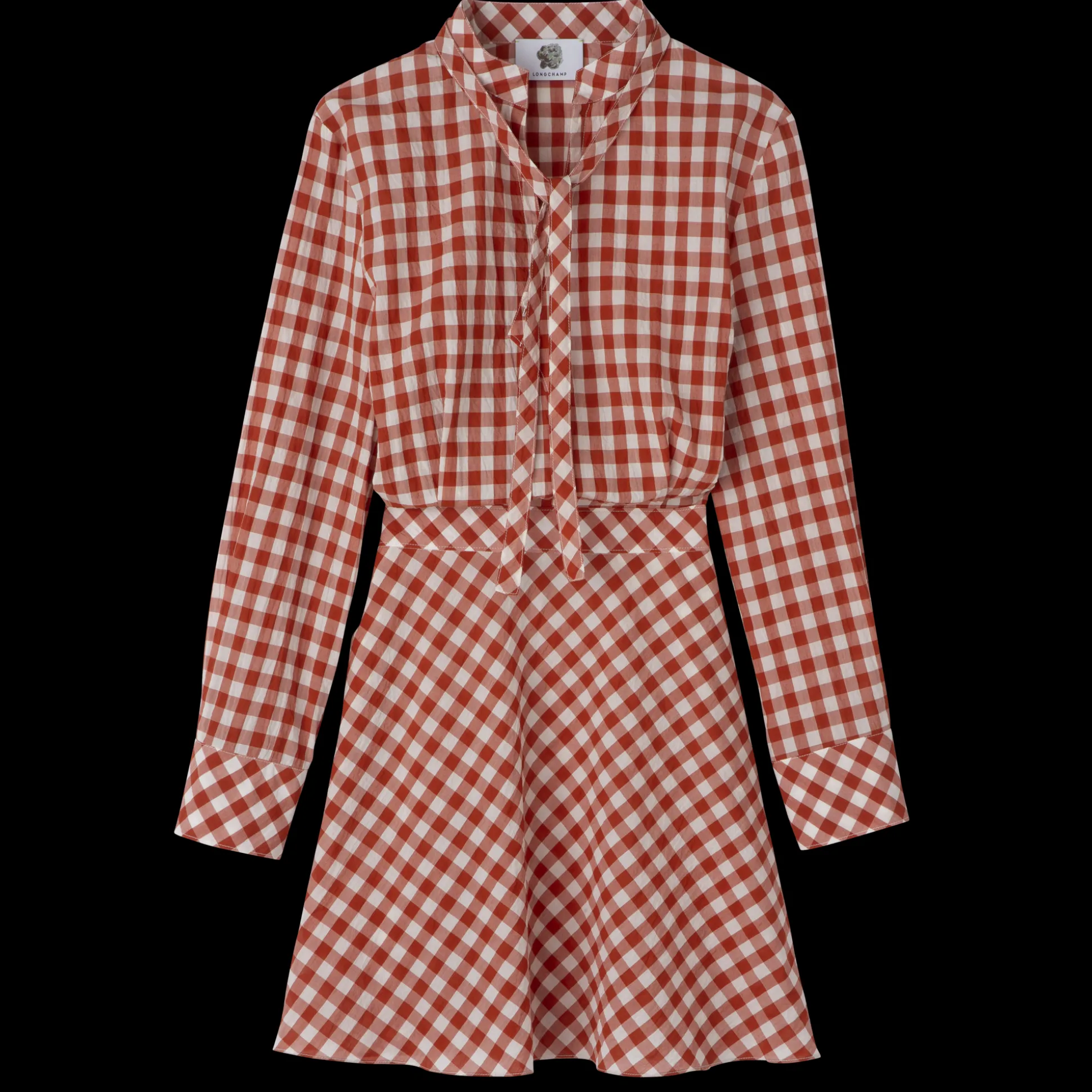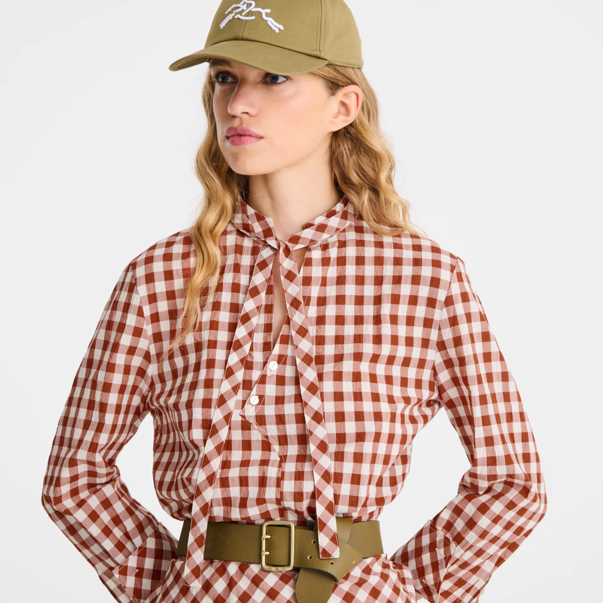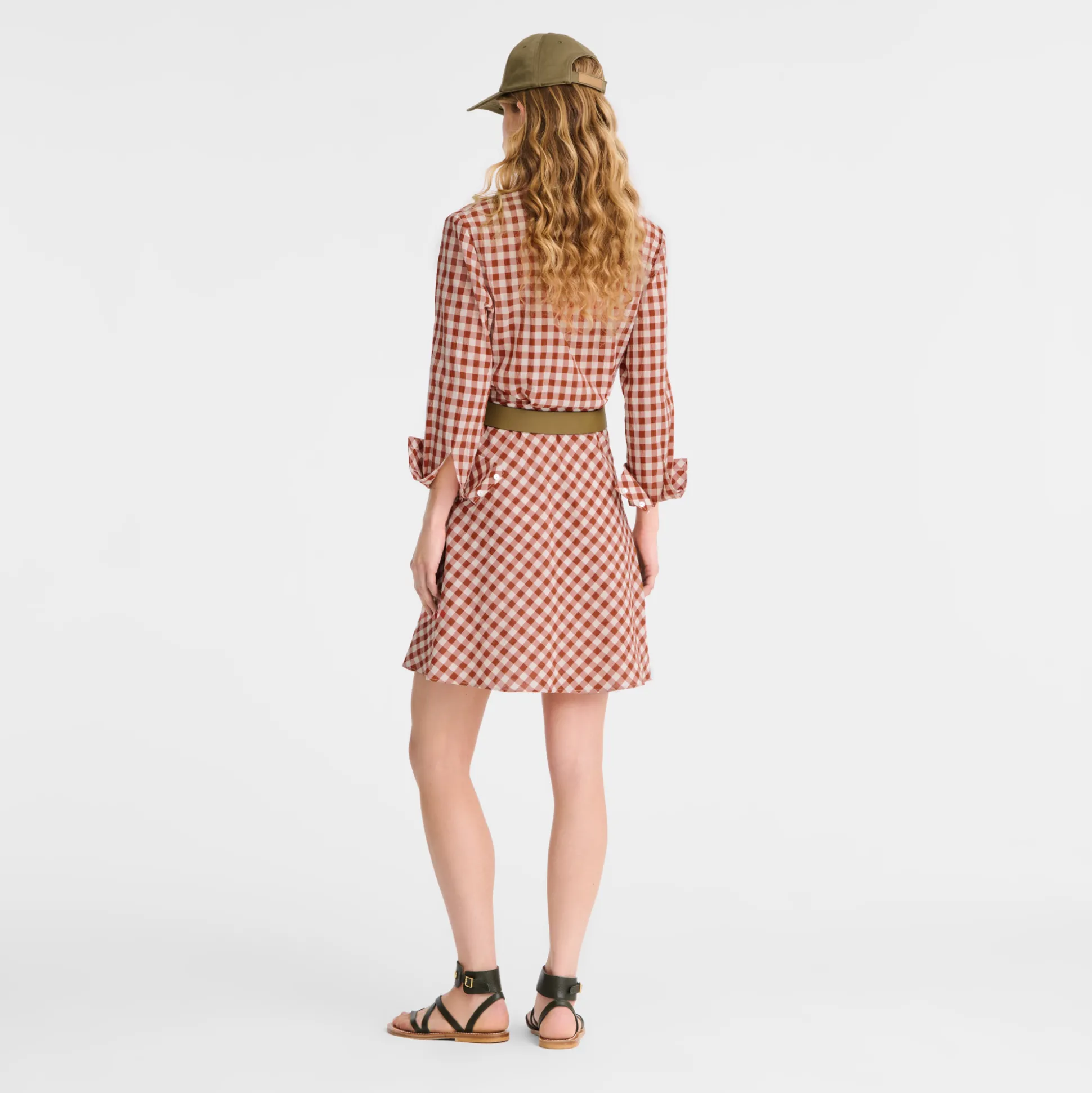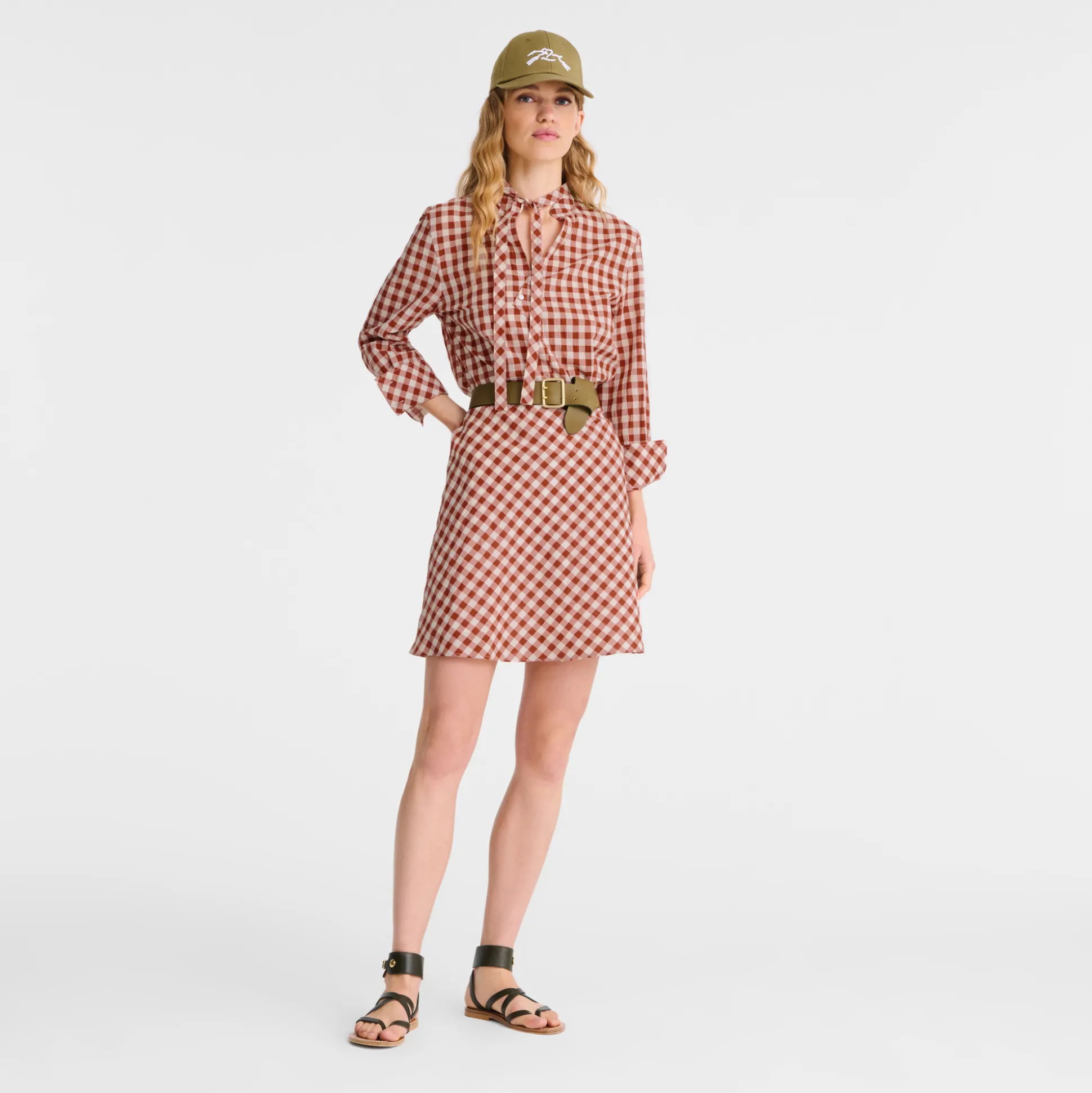 Dieses figurbetonte, langärmlige Kleid in Naturfarben ist mit einem offenen, asymmetrischen Kragen und einem abnehmbaren Band versehen, das den Vichykaro-Print ergänzt. Das strukturierte Modell aus leichter, bequemer Baumwolle betont die Silhouette elegant. In dieser Saison strahlt die Konfektionskollektion der Maison eine anregende, optimistische Energie aus – voller Lebendigkeit, Freude, Zeitlosigkeit und mit einem Hauch rustikalem Charme, perfekt für selbstbewusste Freigeister. Die Pariserin navigiert mühelos durch den Kontrast zwischen städtischem Trubel und ländlicher Ruhe. Sie geht nahtlos über von einem Look mit kräftigen pinken Akzenten zu einem Ensemble mit Farben und Mustern, die von einem Gemüsegarten mit natürlichen, fruchtigen Grüntönen inspiriert sind. Sie enthüllt anmutig jede Facette ihrer selbst und bleibt dabei immer elegant.