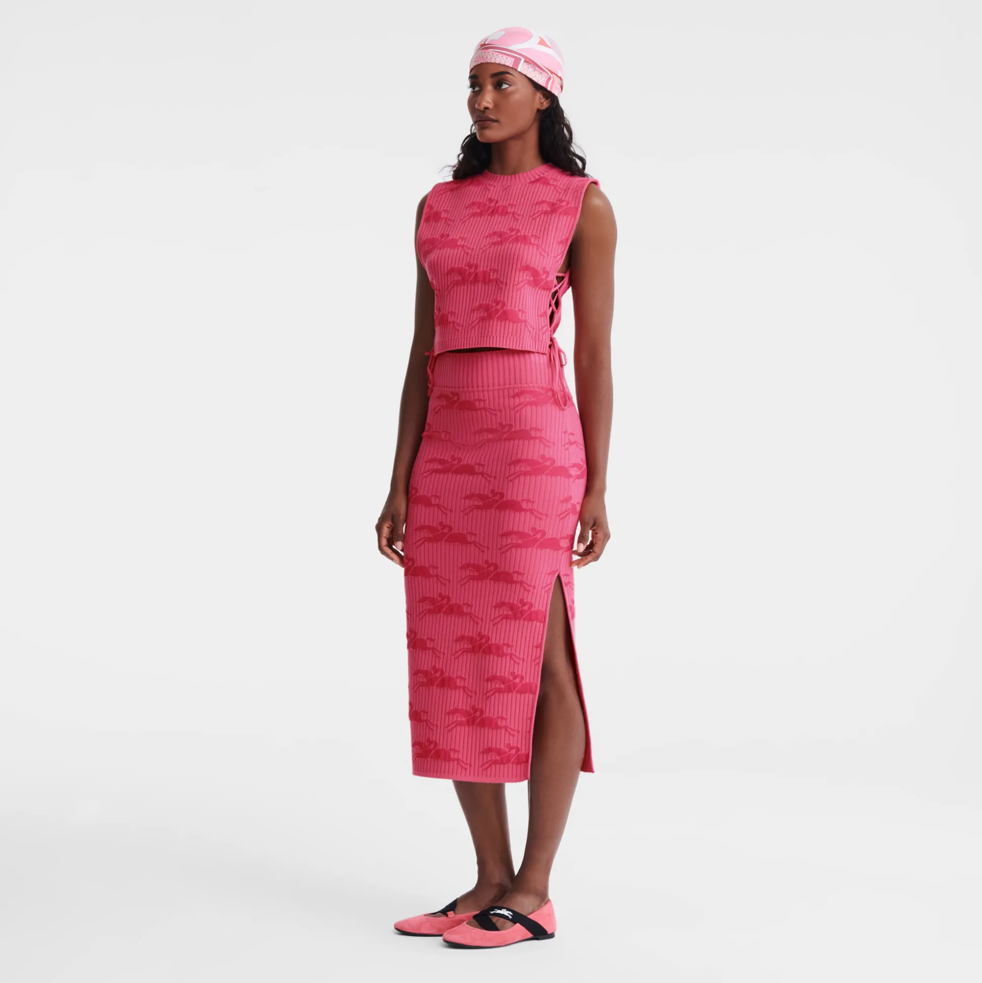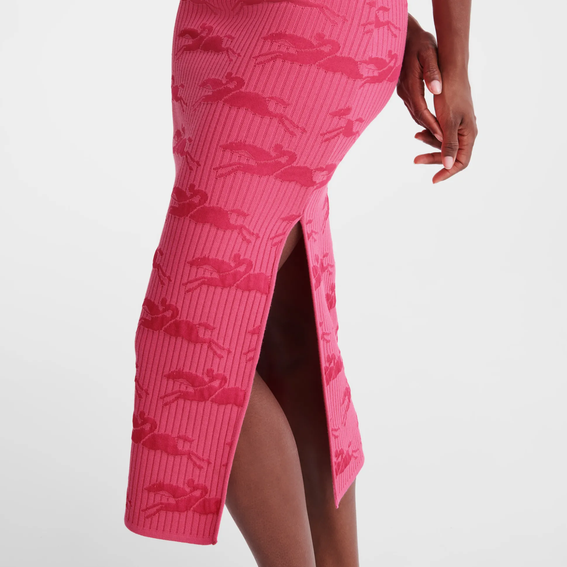 Dieser gestrickte Midirock, der zum gestrickten Oberteil aus derselben Kollektion passt, ist mit dem LONGCHAMP-Pferd in …
