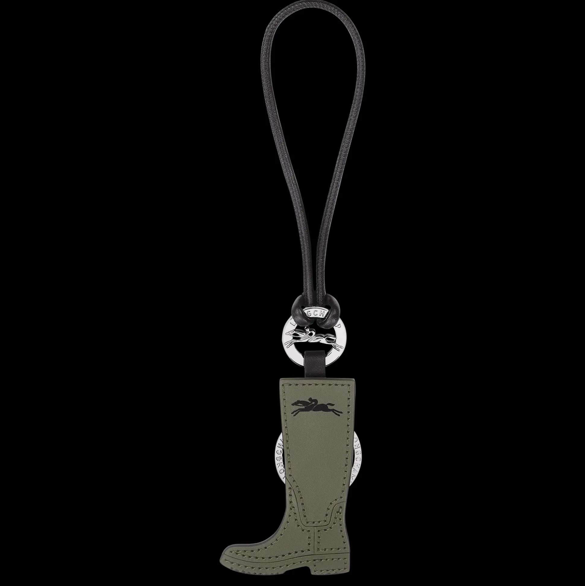 Dieser Schlüsselanhänger aus Rindsleder erinnert an eine Mini-Version des charakteristischen Stiefels von Longchamp. Das Accessoire präsentiert sich mit Lederriemen und Ring mit Longchamp-Logo. Der Schlüsselanhänger ist ein funktionelles Accessoire für den Alltag. Jedes Jahr erneuert das Haus Longchamp seine Kollektion mit neuen, schicken und skurrilen Modellen, um echte Schmuckaccessoires aus Leder oder Metall herzustellen.