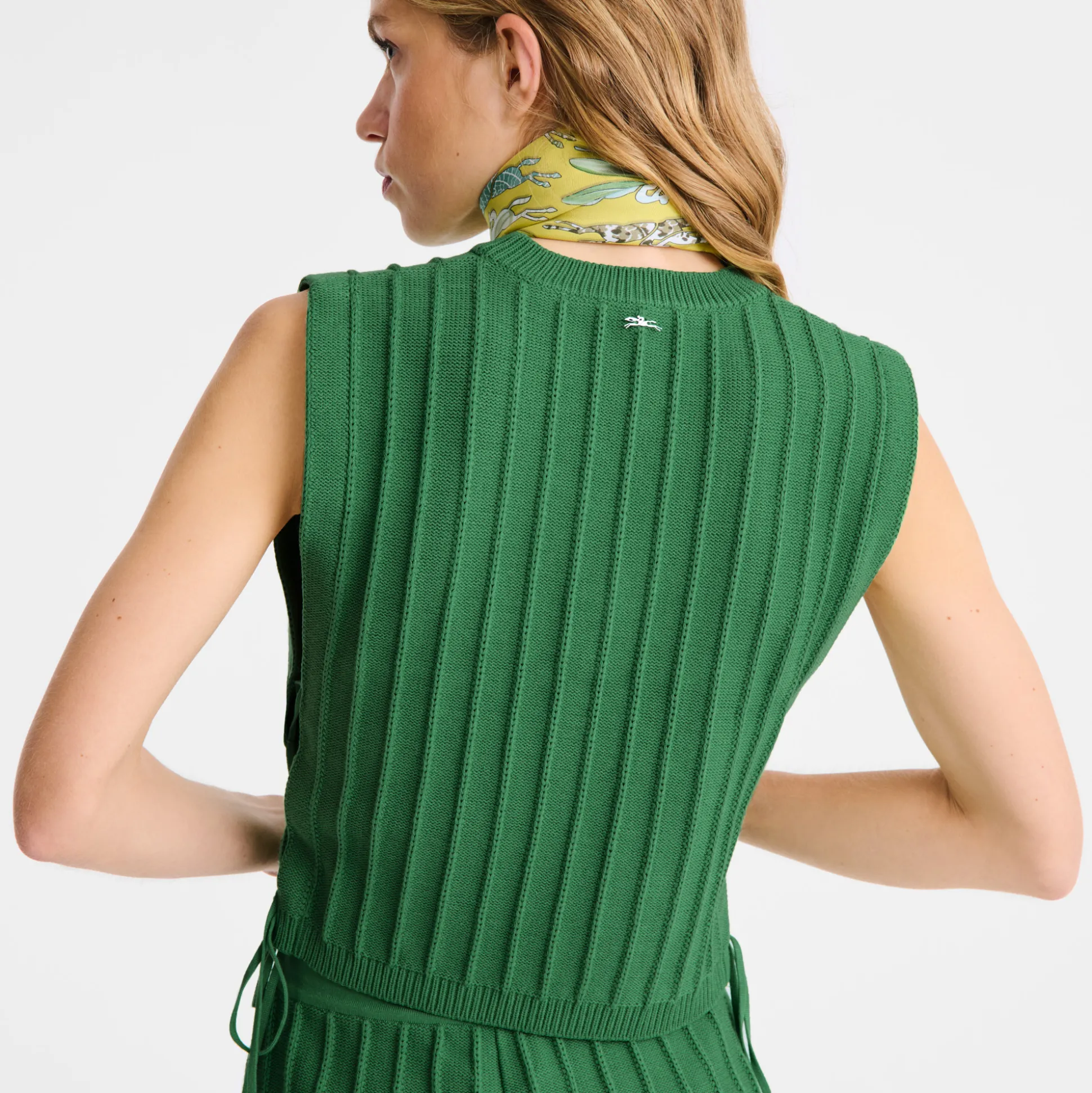Dieses Mesh-Top ist perfekt für alle, die viel unterwegs sind. Es passt perfekt zu den Shorts aus derselben Kollektion. Mit einem breiten Rippenmuster, einem runden Kragen und verstellbaren Kordelzügen an den Seiten bietet dieses elastische, körperbetonte Oberteil sowohl Sinnlichkeit als auch Komfort. Tragen Sie den Style direkt auf der Haut oder über einer Bluse oder einem T-Shirt. In dieser Saison strahlt die Konfektionskollektion der Maison eine anregende, optimistische Energie aus – voller Lebendigkeit, Freude, Zeitlosigkeit und mit einem Hauch rustikalem Charme, perfekt für selbstbewusste Freigeister. Die Pariserin navigiert mühelos durch den Kontrast zwischen städtischem Trubel und ländlicher Ruhe. Sie geht nahtlos über von einem Look mit kräftigen pinken Akzenten zu einem Ensemble mit Farben und Mustern, die von einem Gemüsegarten mit natürlichen, fruchtigen Grüntönen inspiriert sind. Sie enthüllt anmutig jede Facette ihrer selbst und bleibt dabei immer elegant.